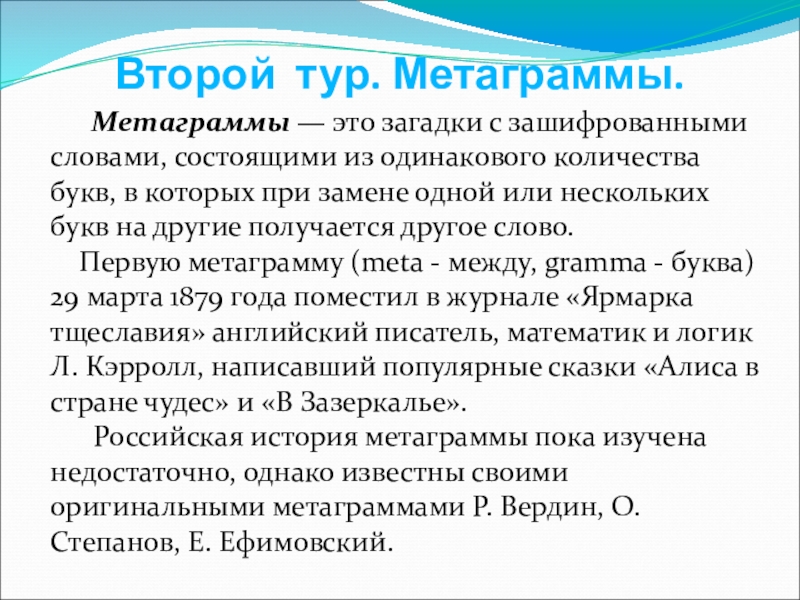 Первую метаграмму (meta - между, gramma - буква) 29 марта 1879 года поместил в журнале «Ярмарка тщеславия» английский писатель, математик и логик Л. Кэрролл, написавший популярные сказки «Алиса в стране чудес» и «В Зазеркалье».