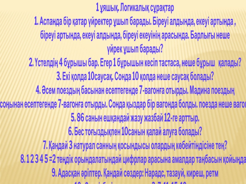 1 ұяшық. Логикалық сұрақтар1. Аспанда бір қатар үйректер ұшып барады. Біреуі алдында, екеуі артында ,біреуі артында, екеуі