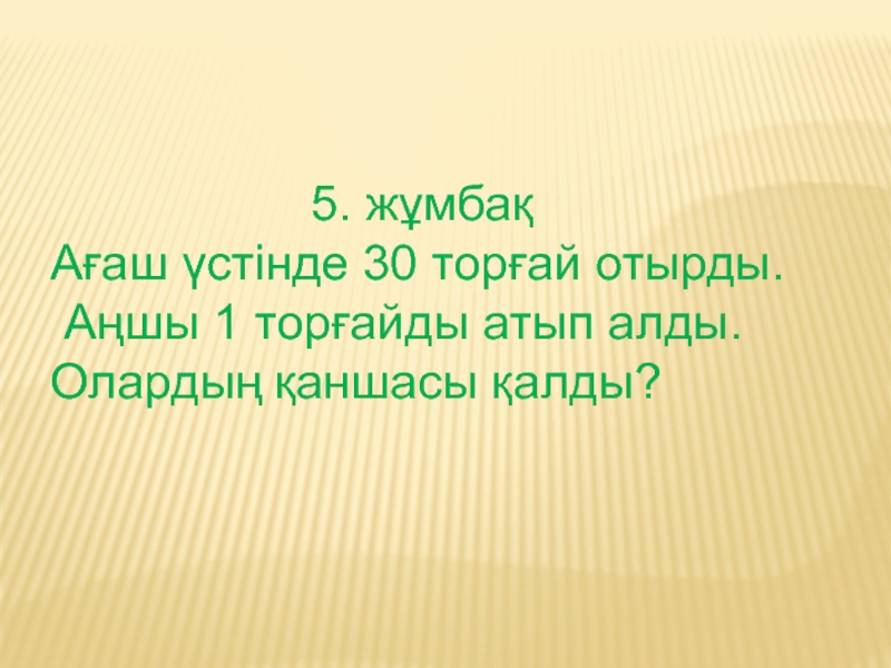 5. жұмбақАғаш үстінде 30 торғай отырды. Аңшы 1 торғайды атып алды. Олардың қаншасы қалды?