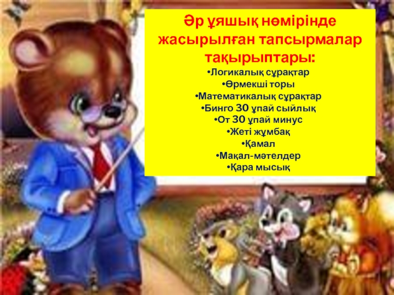 Әр ұяшық нөмірінде жасырылған тапсырмалар тақырыптары:Логикалық сұрақтарӨрмекші торыМатематикалық сұрақтарБинго 30 ұпай сыйлықОт 30 ұпай минусЖеті жұмбақҚамалМақал-мәтелдерҚара мысық
