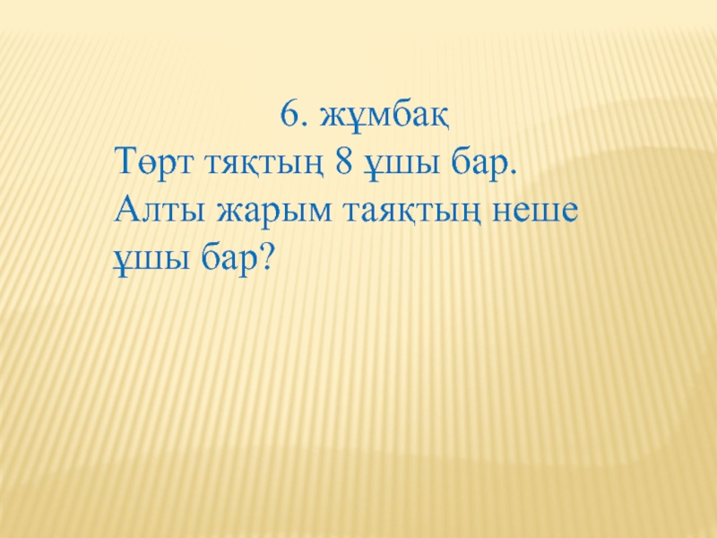 6. жұмбақТөрт тяқтың 8 ұшы бар. Алты жарым таяқтың неше ұшы бар?