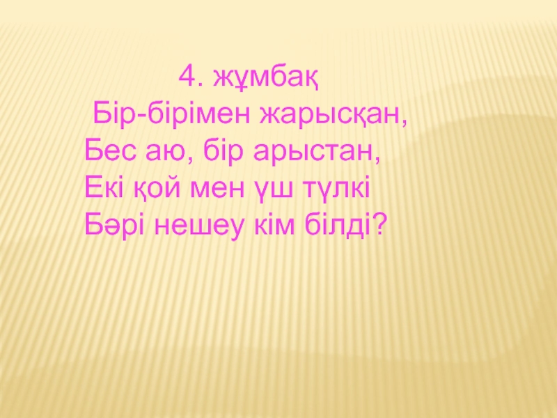 4. жұмбақ Бір-бірімен жарысқан,Бес аю, бір арыстан,Екі қой мен үш түлкіБәрі нешеу кім білді?