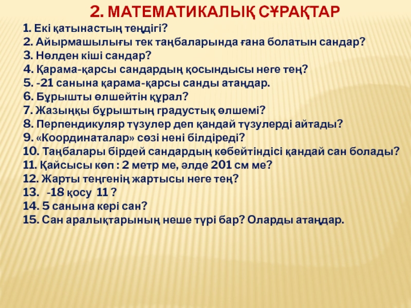 2. Математикалық сұрақтар1. Екі қатынастың теңдігі? 2. Айырмашылығы тек таңбаларында ғана болатын сандар? 3. Нөлден кіші сандар?4.