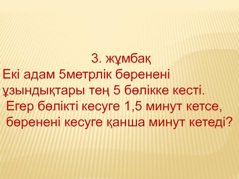 3. жұмбақЕкі адам 5метрлік бөренені ұзындықтары тең 5 бөлікке кесті. Егер бөлікті кесуге 1,5 минут кетсе, бөренені кесуге