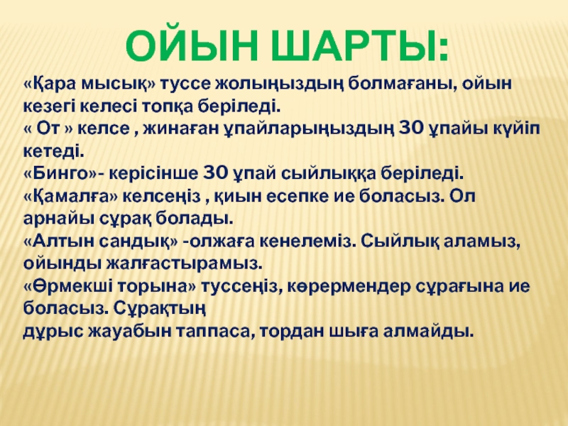 Ойын шарты:«Қара мысық» туссе жолыңыздың болмағаны, ойын кезегі келесі топқа беріледі.« От » келсе , жинаған ұпайларыңыздың