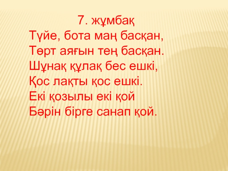 7. жұмбақТүйе, бота маң басқан, Төрт аяғын тең басқан.Шұнақ құлақ бес ешкі,Қос лақты қос ешкі.Екі қозылы екі қойБәрін
