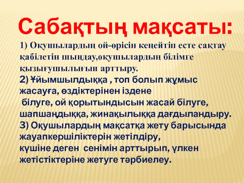 Сабақтың мақсаты:1) Оқушылардың ой-өрісін кеңейтіп есте сақтау қабілетін шыңдау,оқушылардың білімге қызығушылығын арттыру.2) Ұйымшылдыққа , топ болып жұмыс