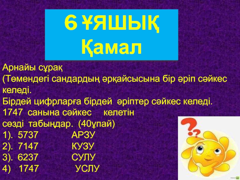 6 ҰЯШЫҚҚамалАрнайы сұрақ      (Төмендегі сандардың әрқайсысына бір әріп сәйкес келеді.Бірдей цифрларға бірдей  әріптер сәйкес келеді.