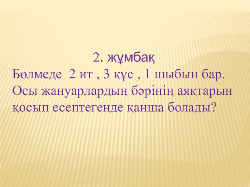 2. жұмбақБөлмеде  2 ит , 3 құс , 1 шыбын бар.Осы жануарлардың бәрінің аяқтарынқосып есептегенде қанша болады?