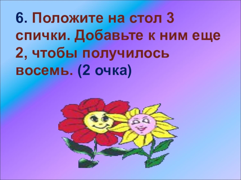 Слайд 526. Положите на стол 3 спички. Добавьте к ним еще 2,