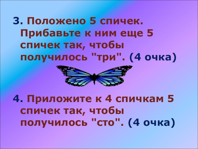 4. Приложите к 4 спичкам 5 спичек так, чтобы получилось "сто". (4 очка)