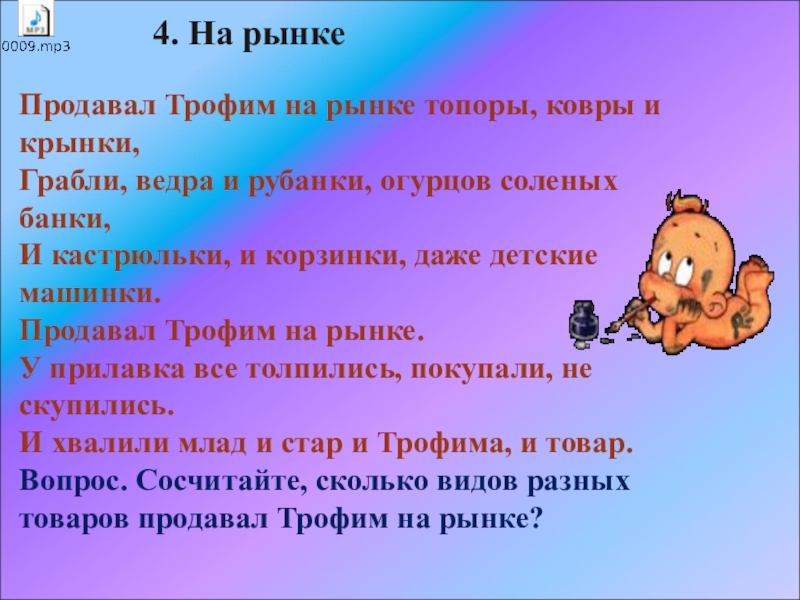 Вопрос. Сосчитайте, сколько видов разных товаров продавал Трофим на рынке?