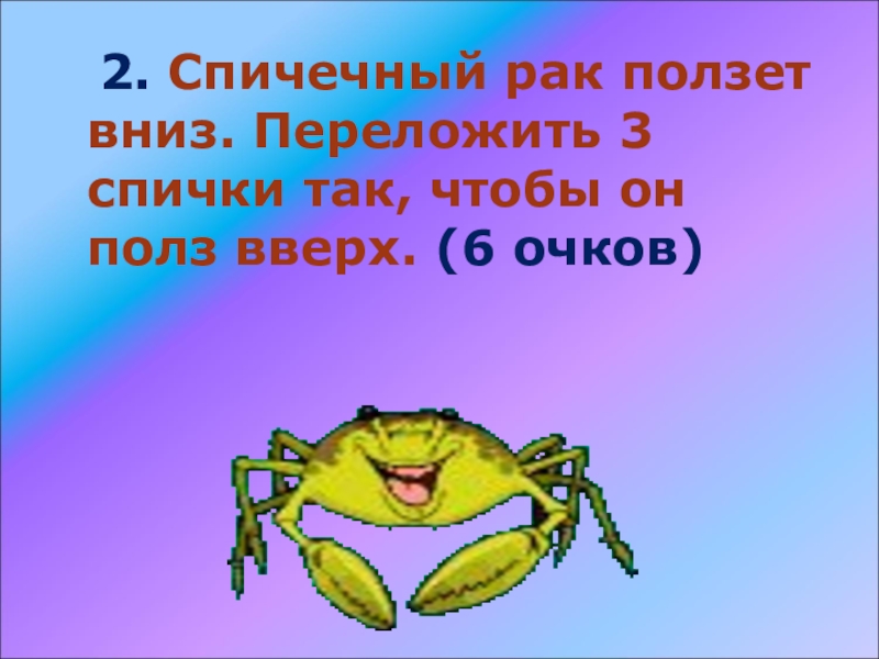 Слайд 46 2. Спичечный рак ползет вниз. Переложить 3 спички так,