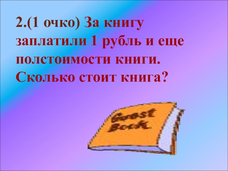 Слайд 562.(1 очко) За книгу заплатили 1 рубль и еще полстоимости книги.