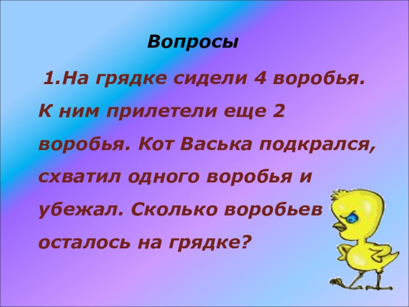 1.На грядке сидели 4 воробья. К ним прилетели еще 2 воробья. Кот Васька подкрался, схватил одного воробья и убежал. Сколько воробьев осталось на грядке?