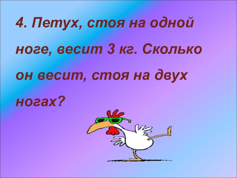 Слайд 104. Петух, стоя на одной ноге, весит 3 кг. Сколько он