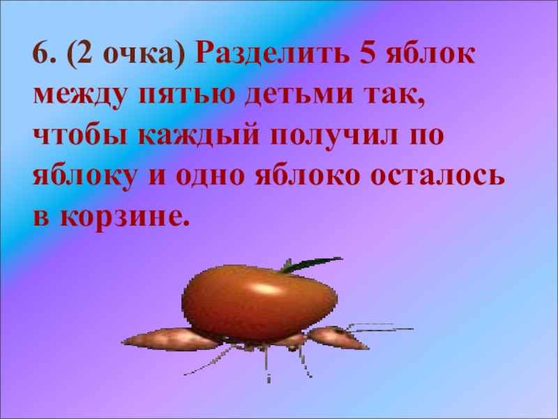 Слайд 646. (2 очка) Разделить 5 яблок между пятью детьми так, чтобы
