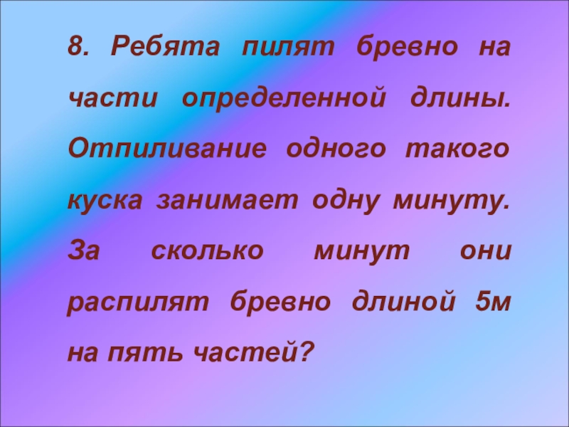 куска занимает одну минуту. За сколько минут они распилят бревно длиной 5м на пять частей?