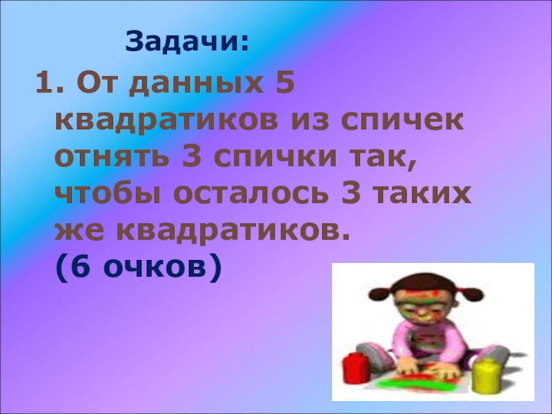 квадратиков из спичек отнять 3 спички так, чтобы осталось 3 таких же квадратиков. (6 очков)