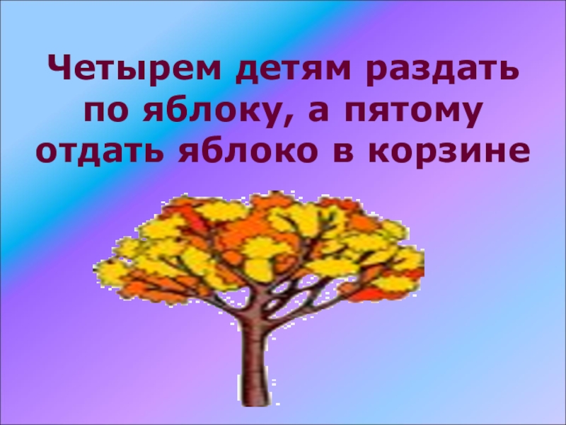 Слайд 65Четырем детям раздать по яблоку, а пятому отдать яблоко в корзине
