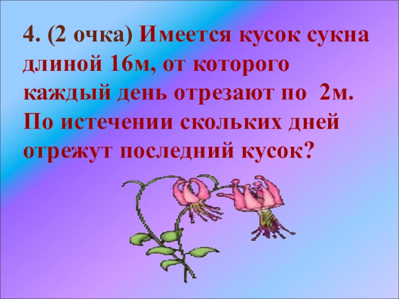 Слайд 604. (2 очка) Имеется кусок сукна длиной 16м, от которого каждый