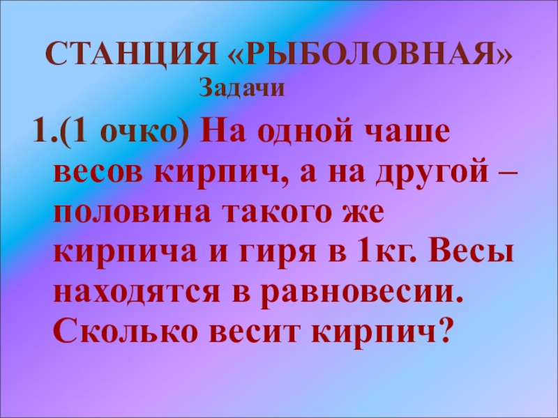 1.(1 очко) На одной чаше весов кирпич, а на другой – половина такого же кирпича и гиря в 1кг. Весы находятся в равновесии. Сколько весит кирпич?