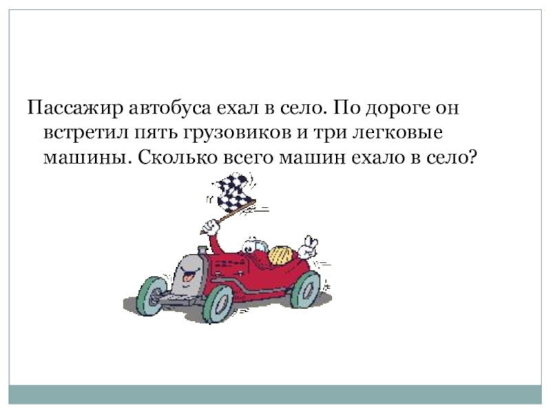 Слайд 21Пассажир автобуса ехал в село. По дороге он встретил пять грузовиков