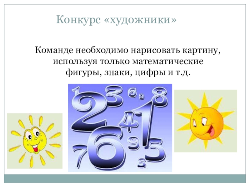 Конкурс «художники»  Команде необходимо нарисовать картину, используя только математические фигуры, знаки, цифры и т.д.