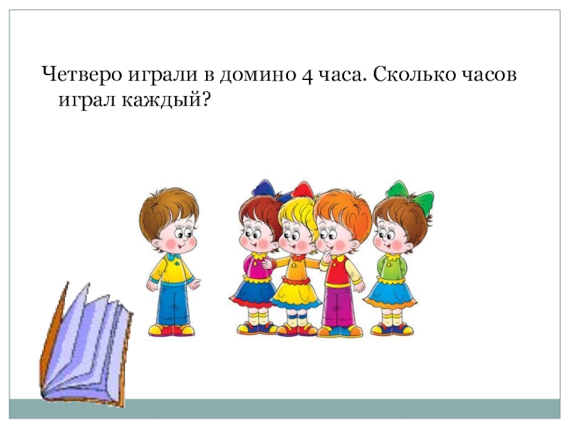 Слайд 3Четверо играли в домино 4 часа. Сколько часов играл каждый?