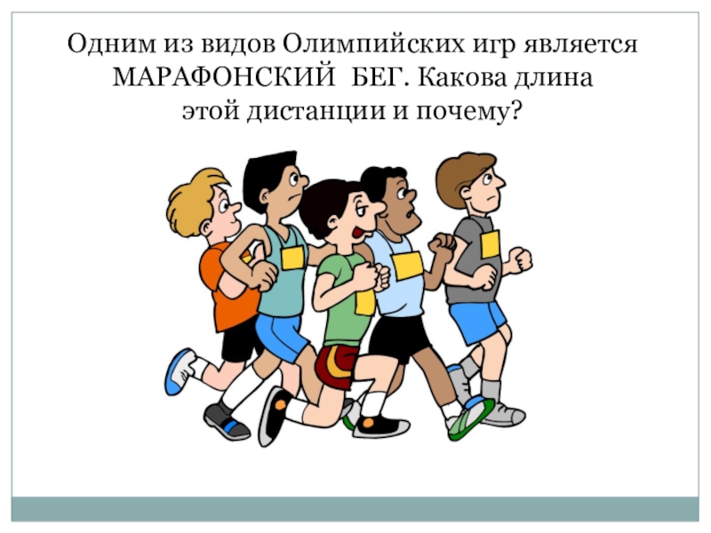 Слайд 8Одним из видов Олимпийских игр является МАРАФОНСКИЙ БЕГ. Какова длина этой дистанции