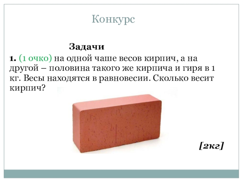 1. (1 очко) на одной чаше весов кирпич, а на другой – половина такого же кирпича и гиря в 1 кг. Весы находятся в равновесии. Сколько весит кирпич?