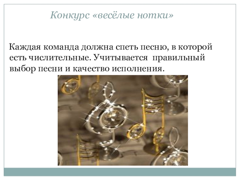 Конкурс «весёлые нотки»   Каждая команда должна спеть песню, в которой есть числительные. Учитывается правильный выбор
