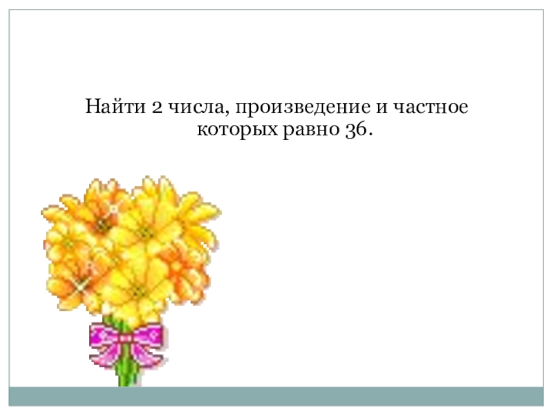 Слайд 5Найти 2 числа, произведение и частное которых равно 36.
