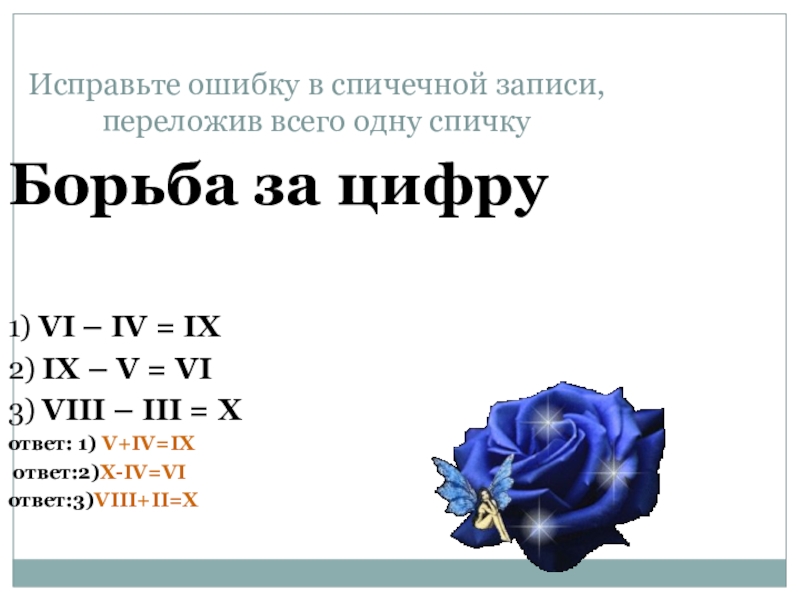 Исправьте ошибку в спичечной записи, переложив всего одну спичку Борьба за цифру1) VI – IV = IX2)