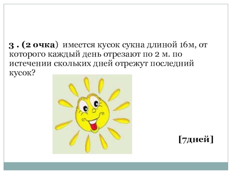 Слайд 29 3 . (2 очка) имеется кусок сукна длиной 16м,