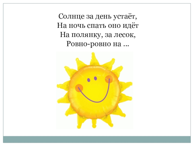 Солнце за день устаёт,На ночь спать оно идётНа полянку, за лесок,Ровно-ровно на ...
