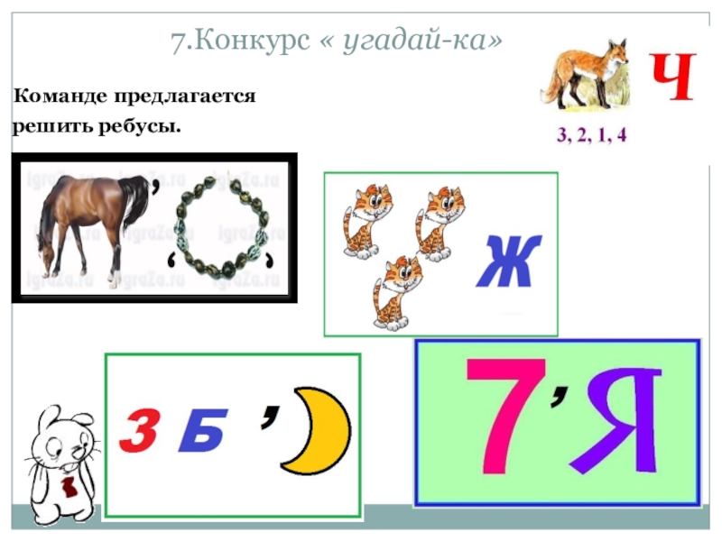 7.Конкурс « угадай-ка»  Команде предлагается решить ребусы.