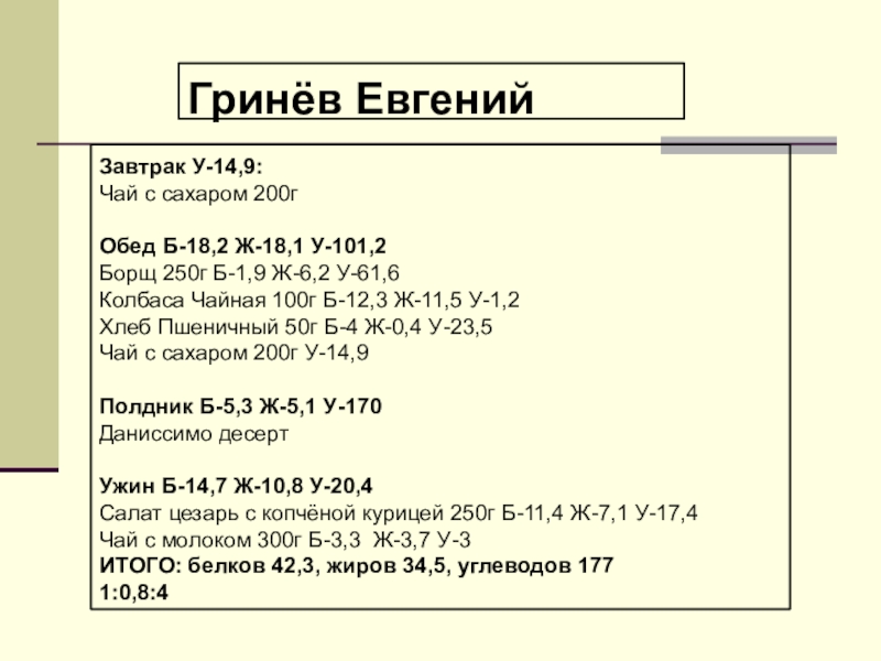 ИТОГО: белков 42,3, жиров 34,5, углеводов 177