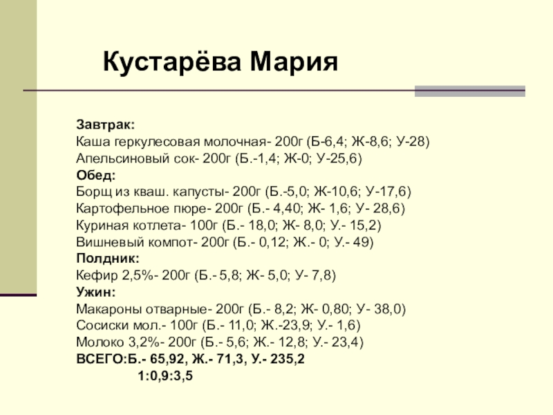 ИТОГО: белков 53, жиров 31, углеводов 377.4 1:0,6:7