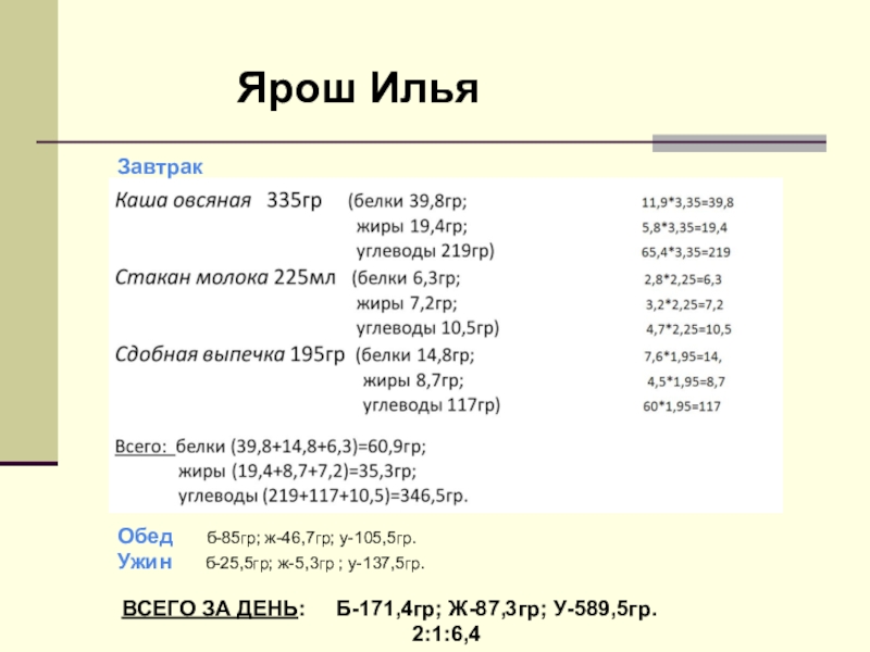 Обед б-85гр; ж-46,7гр; у-105,5гр.