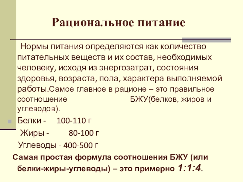 необходимых человеку, исходя из энергозатрат, состояния здоровья, возраста, пола, характера выполняемой работы.Самое главное в рационе – это правильное соотношение БЖУ(белков, жиров и углеводов).