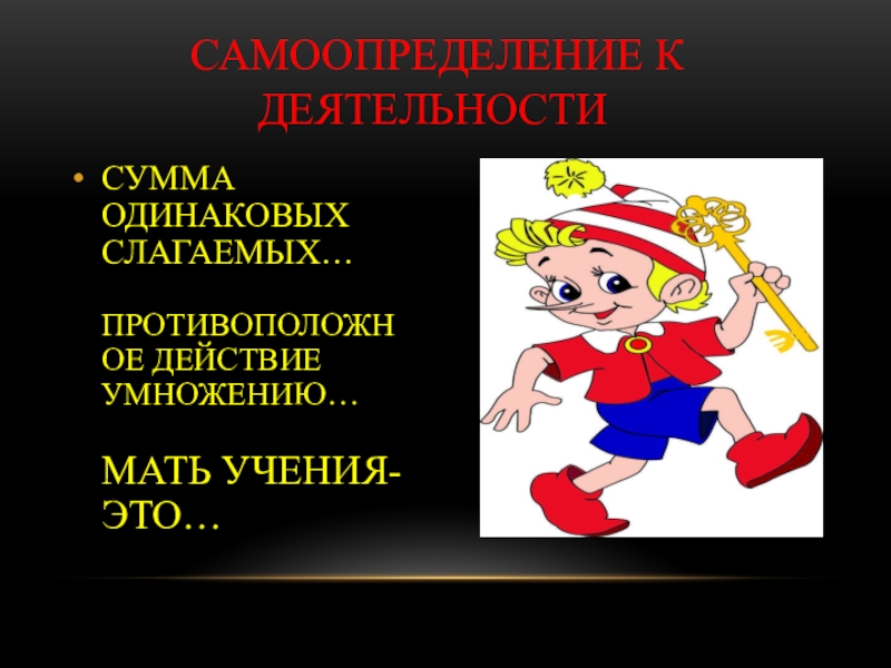 СУММА ОДИНАКОВЫХ СЛАГАЕМЫХ… ПРОТИВОПОЛОЖНОЕ ДЕЙСТВИЕ УМНОЖЕНИЮ… МАТЬ УЧЕНИЯ-ЭТО… САМООПРЕДЕЛЕНИЕ К ДЕЯТЕЛЬНОСТИ