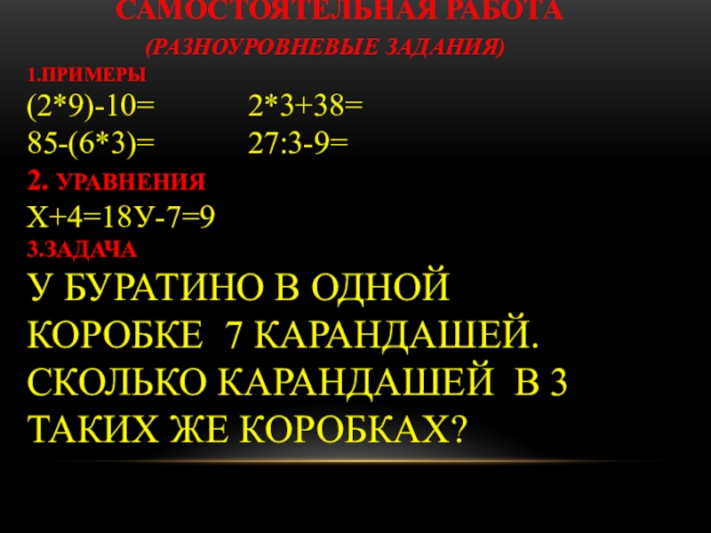 (РАЗНОУРОВНЕВЫЕ ЗАДАНИЯ) 1.ПРИМЕРЫ (2*9)-10= 2*3+38= 85-(6*3)= 27:3-9= 2. УРАВНЕНИЯ Х+4=18 У-7=9 3.ЗАДАЧА У БУРАТИНО В ОДНОЙ КОРОБКЕ 7 КАРАНДАШЕЙ. СКОЛЬКО КАРАНДАШЕЙ В 3 ТАКИХ ЖЕ КОРОБКАХ?
