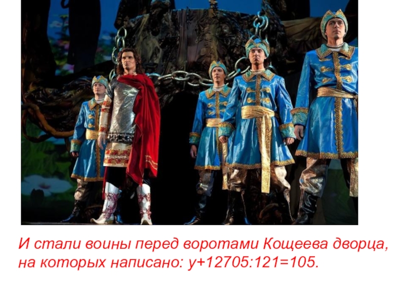 И стали воины перед воротами Кощеева дворца,на которых написано: у+12705:121=105.