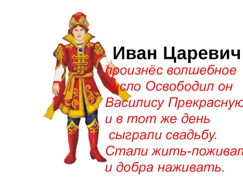 произнёс волшебноечисло Освободил онВасилису Прекрасную,и в тот же день сыграли свадьбу.Стали жить-поживатьи добра наживать.