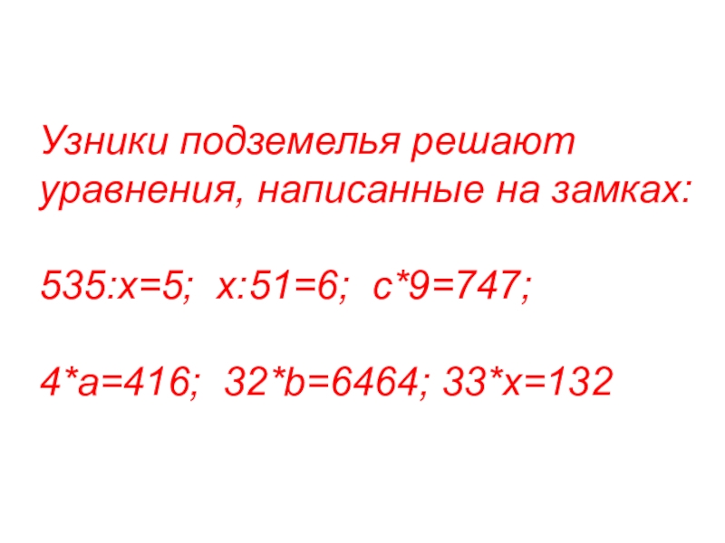 Узники подземелья решаютуравнения, написанные на замках:535:х=5; х:51=6; с*9=747;4*a=416; 32*b=6464; 33*x=132
