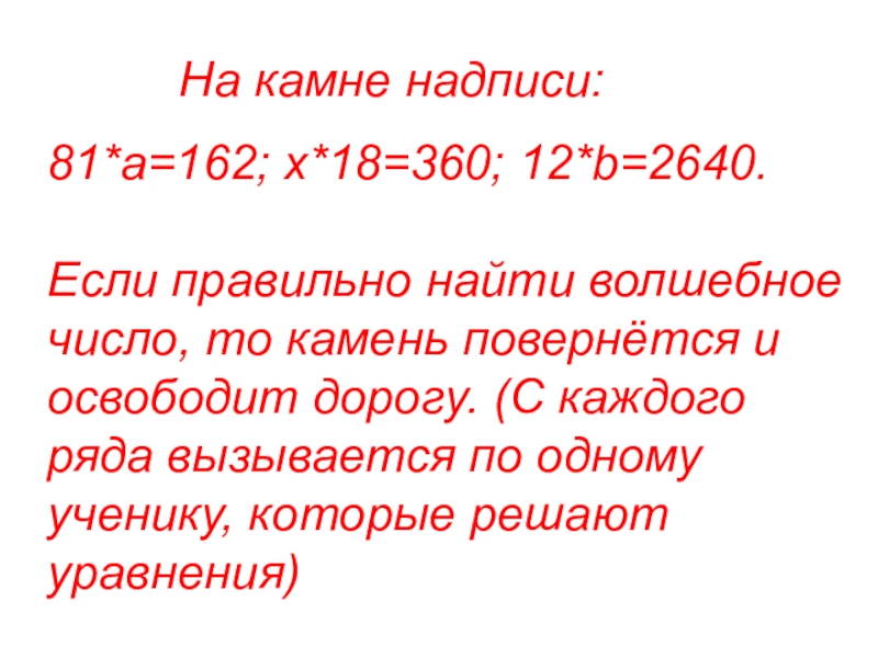 На камне надписи:81*a=162; x*18=360; 12*b=2640.Если правильно найти волшебноечисло, то камень повернётся иосвободит дорогу. (С каждогоряда вызывается по