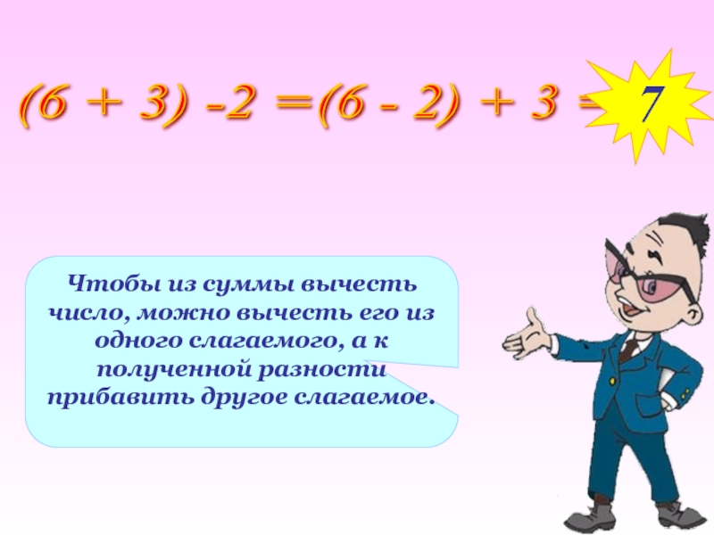 Для того чтобы вычесть сумму из числа, можно сначала вычесть из этого числа первое слагаемое, а потом, из полученной разности – второе слагаемое.