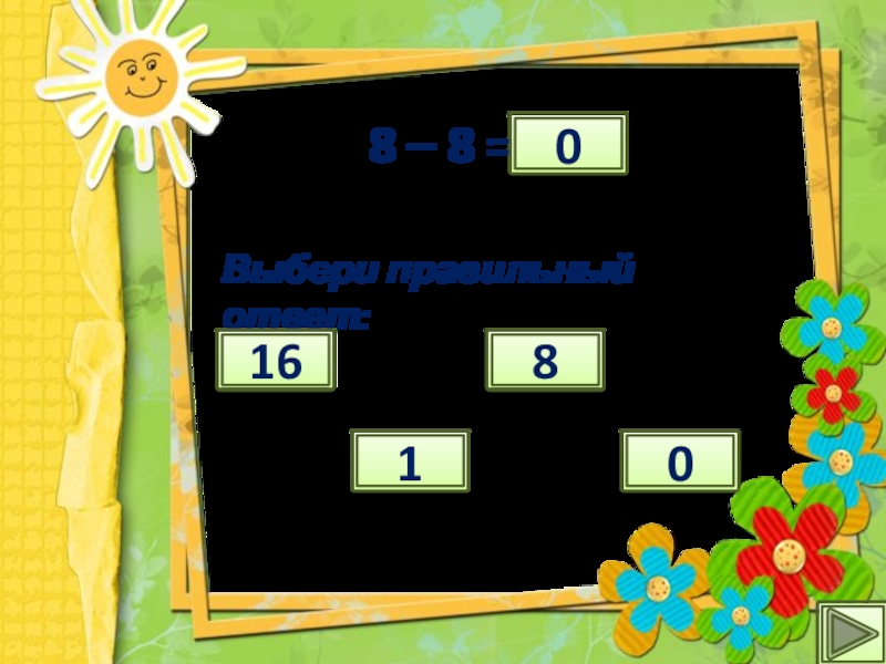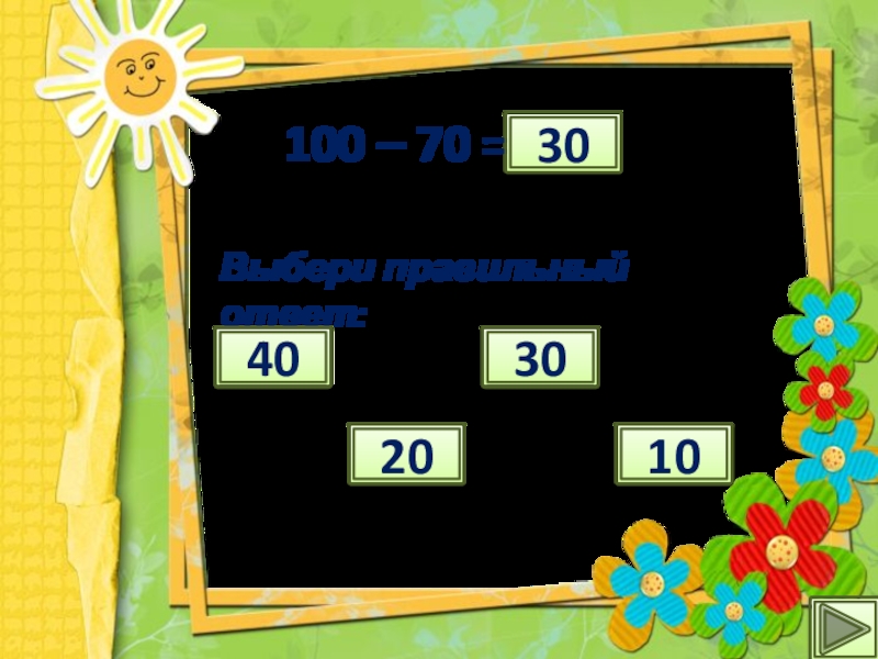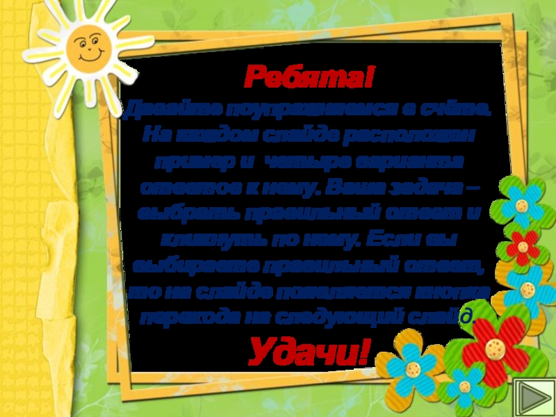 Ребята!Давайте поупражняемся в счёте. На каждом слайде расположен пример и четыре варианта ответов к нему. Ваша задача – выбрать правильный ответ и кликнуть по нему. Если вы выбираете правильный ответ, то на слайде появляется кнопка перехода