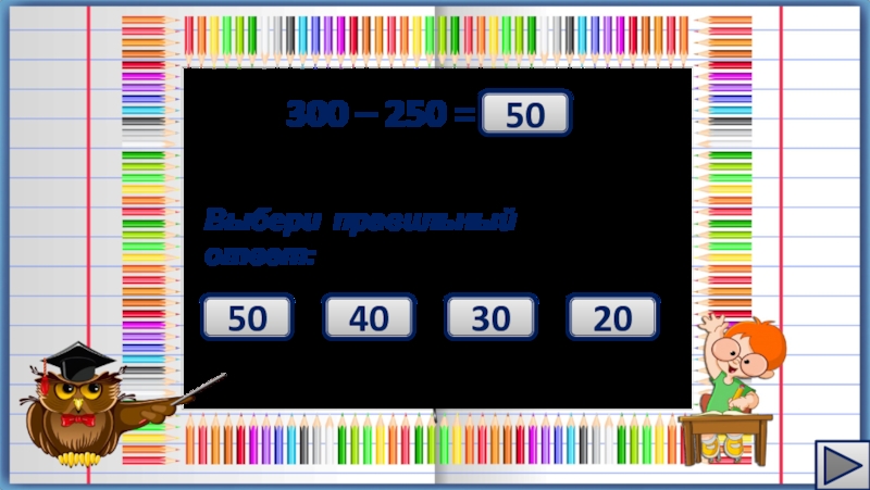 300 – 250 = ? Выбери правильный ответ:5050304020